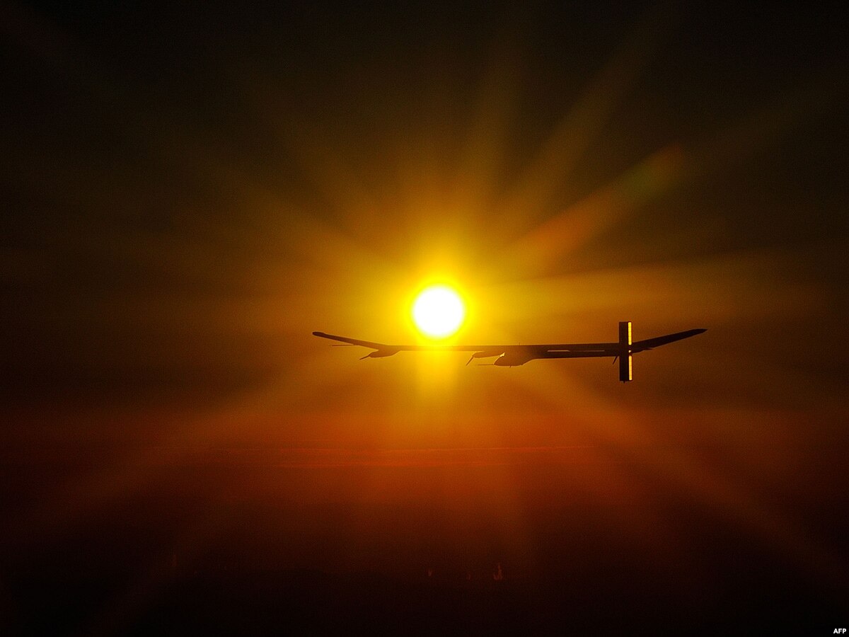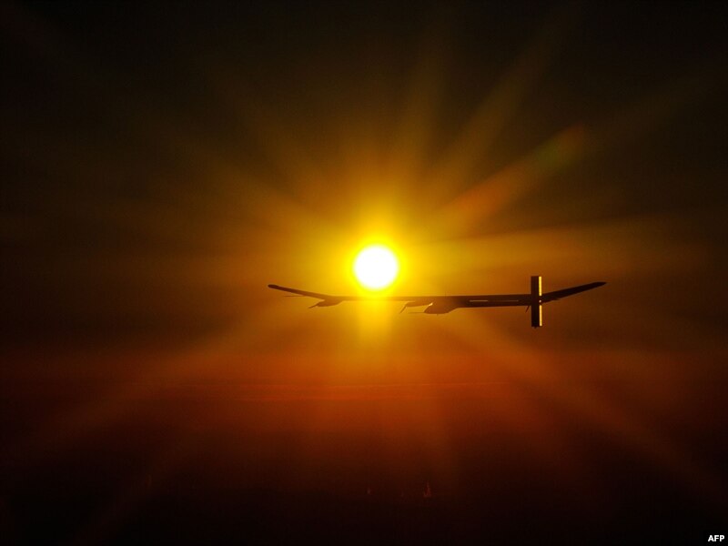Switzerland -- Experimental aircraft "Solar Impulse" with pilot Andre Borschberg onboard flies at sunrise above Payerne's Swiss airbase on 08Jul2010